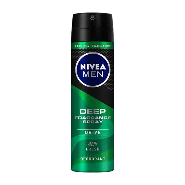 اسپری دیپ فرگرانس درایو نیوا NIVEA DEEP FRAGRANCE SPRAY DRIVE 48h Fresh یک اسپری بدن مردانه با حجم 150 میلی‌لیتر است که با هدف ایجاد حس تازگی و محافظت در برابر تعریق برای آقایان طراحی شده است. این اسپری با ماندگاری 48 ساعته، رایحه‌ای دلپذیر از ترکیب نت‌های مرکبات، کاج و چوب را به ارمغان می‌آورد که حس شادابی و انرژی را در طول روز حفظ می‌کند. وجود الکل در ترکیبات این اسپری به پخش بهتر رایحه و همچنین خاصیت ضدعفونی‌کنندگی آن کمک می‌کند.