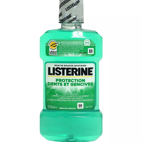 دهان شویه Listerine لیسترین مدل protection dents et gencives یکی از پرطرفدارترین دهان شویه ها می باشد و تمیز کنندگی فوق العاده ای دارد و با توجه به داشتن فلوراید می تواند از دندان های شما محافظت کند و از تشکیل پلاک ها جلوگیری می کند تا لثه های شما مقاوم شوند به گونه ای که استفاده از مقدار کمی از آن سبب می‌شود رشد پلاک‌های دندان به تعویق بیفتد.